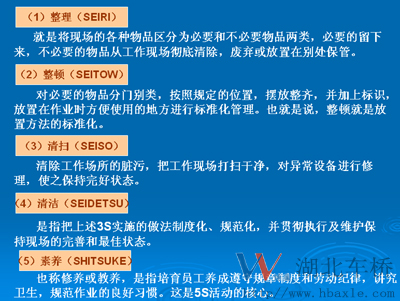 ①現(xiàn)場檢查。②區(qū)分必需品和非必需品。③清除非必需品。④處理非必需品。⑤每天循環(huán)整理。