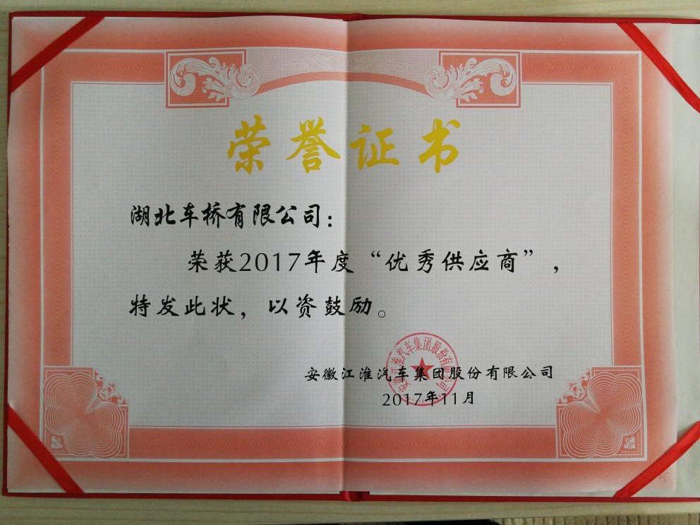 喜訊:熱烈慶祝湖北車橋有限公司榮獲安徽江淮汽車集團股份有限公司2017年年度優秀供應商