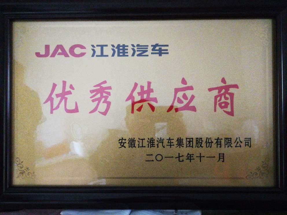 2017年11月15日,安徽江淮汽車集團股份有限公司邀請各大供應商召開2017年年會,我司在此次會議中榮獲安徽江淮汽車集團股份有限公司2017年年度最高榮譽獎——優秀供應商。